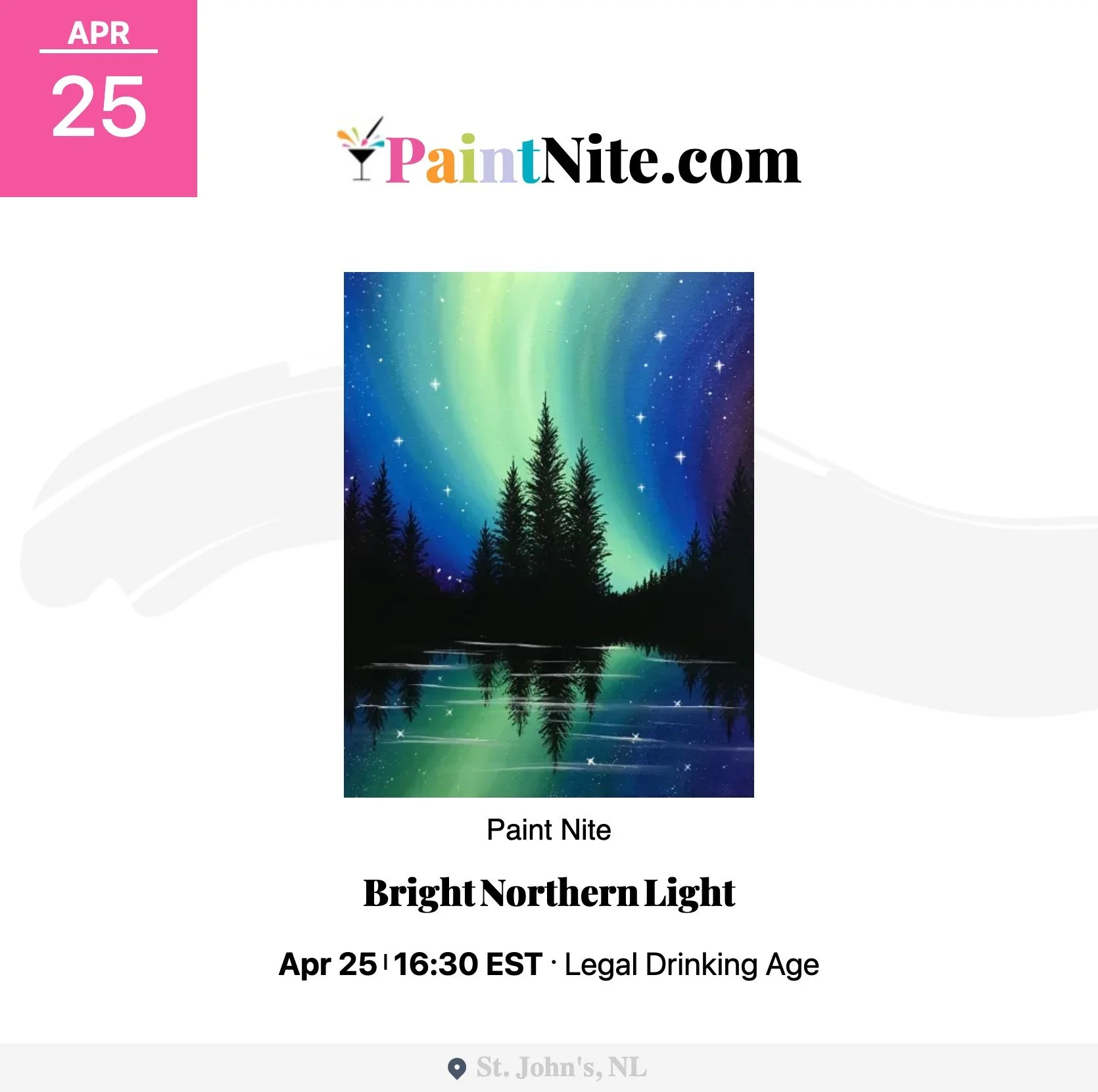 Paint Nite: Bright Northern Light is coming to Wooden Walls Distilling on Saturday, April 25, 2026, at 4:30 PM for a relaxed paint-and-sip experience led by a local artist—no experience required. Your ticket includes all art supplies, a 2-hour guided painting session, and a complimentary drink (tax and gratuity included). Perfect for a date night, friends’ night out, or trying something new in St. John’s.